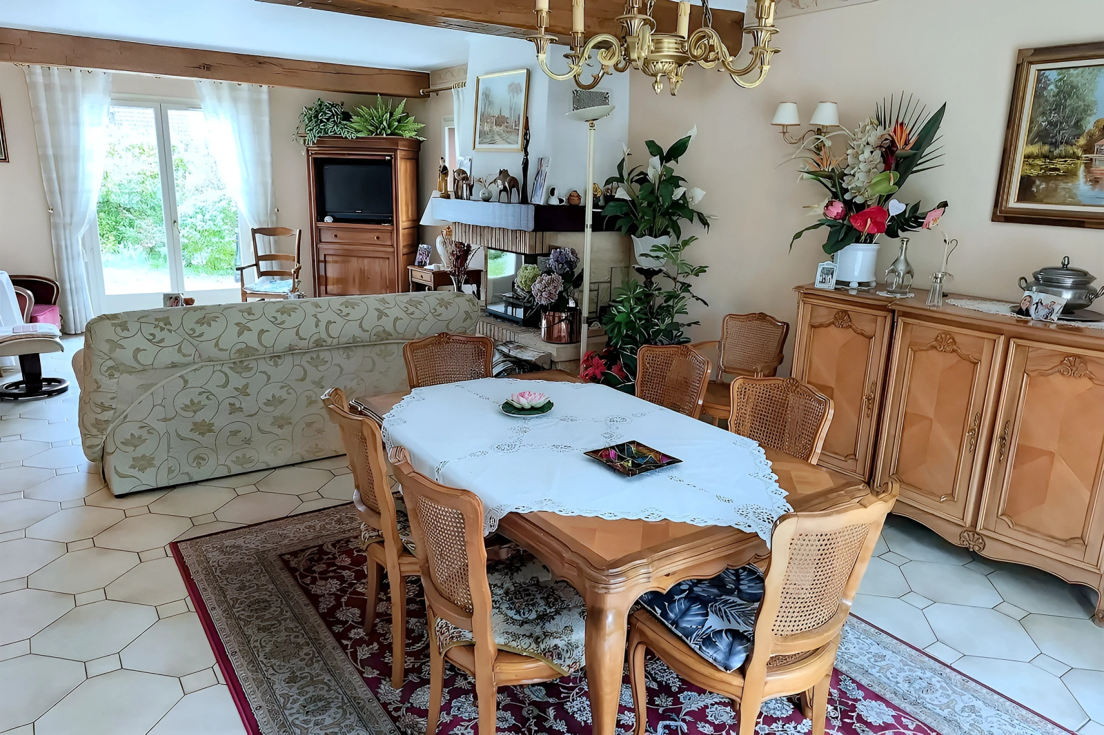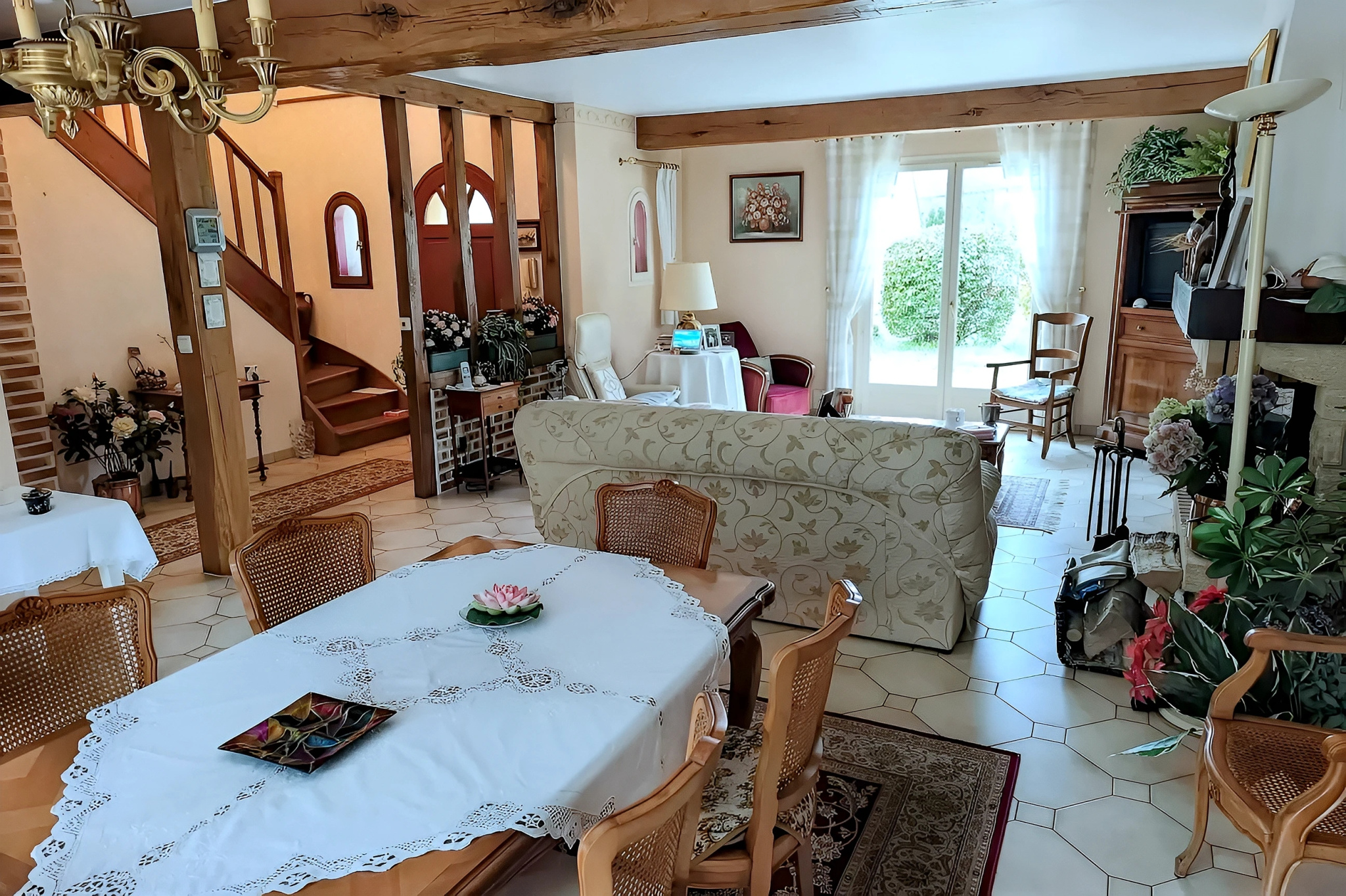 Entrée, vaste séjour double lumineux, cuisine aménagée et équipée.
