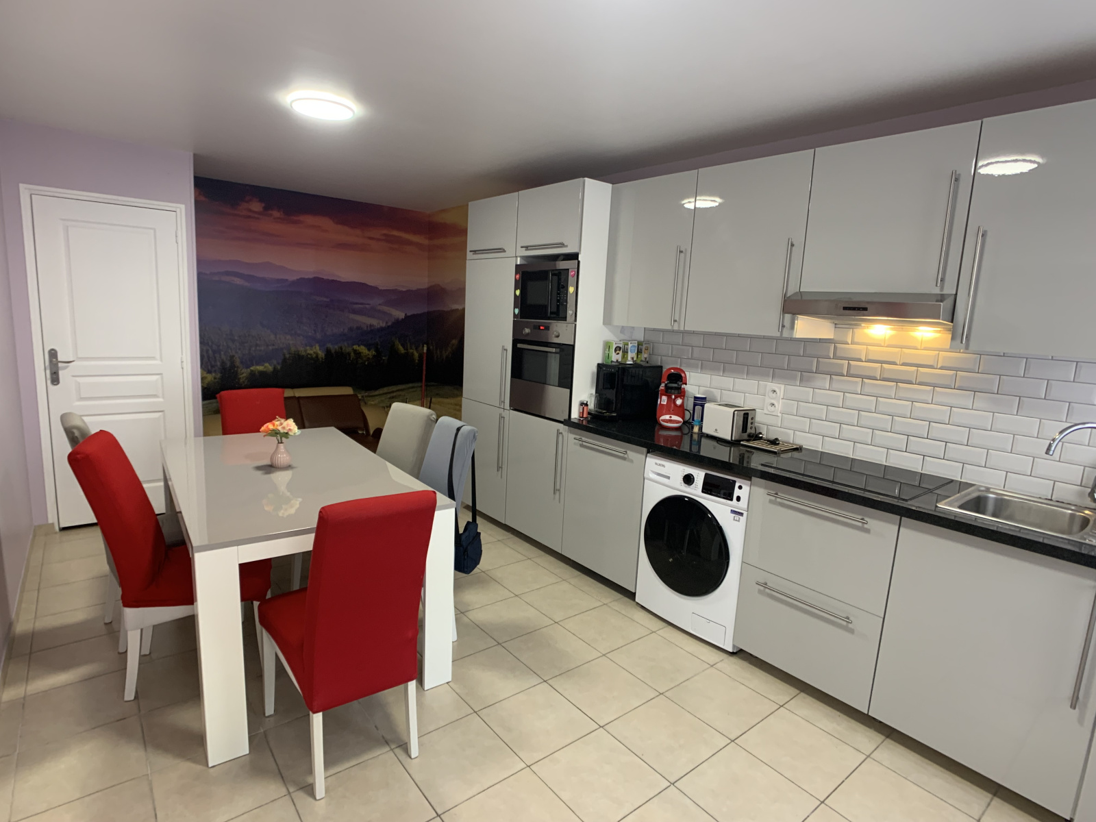 La maison principale comprend au rdc : Entrée, salon, cuisine aménagée et équipée, wc.